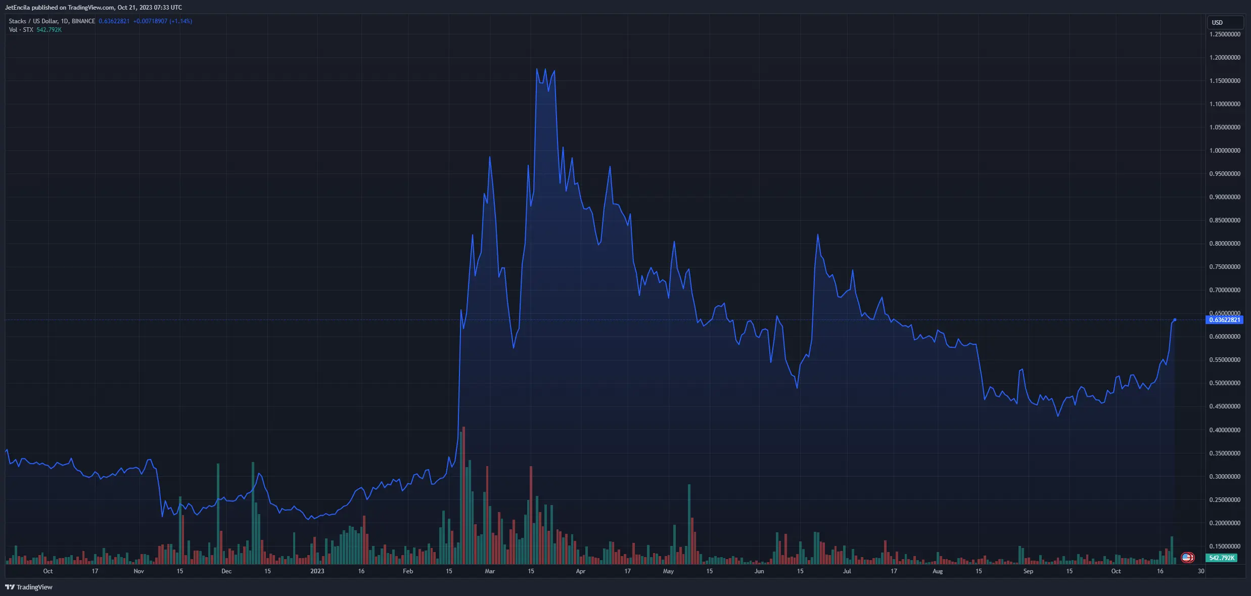 STXUSD trading at $0.636 on the weekend chart on TradingView.com