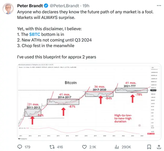 Meanwhile, Peter Brandt shares the more common conception that Bitcoin will not reach its ATH Q4 2024. The analyst also states that the Bitcoin bottom is already in, and the price will be a “chop fest” until its ATH.