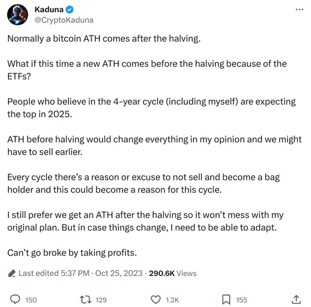 Kaduna speculates that the excitement of spot ETFs could cause an ATH before the halving. This would be an unprecedented event, catching many investors off guard. However, it would also provide ample liquidity for institutions to buy / long crypto, counter-trading the well-known four-year-cycle narrative.