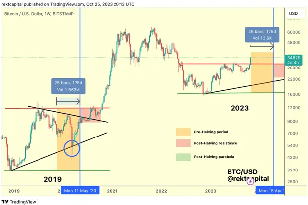 Rekt Capital noted in another tweet that Bitcoin is following a different trajectory to pre-halving in 2019.