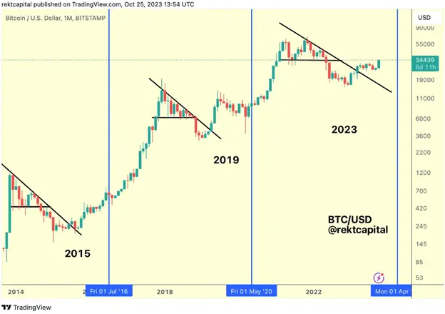 Esteemed trader Rekt Capital has also weighed in on Bitcoin’s current outlook, noting that it has already broken its macro downtrend to enter a new bull market.