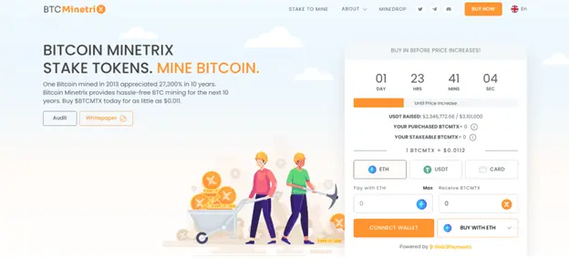 Bitcoin Minetrix is a new cryptocurrency platform enabling users to mine Bitcoin by staking $BTCMTX on its Ethereum-based platform. They receive Bitcoin mining credits in return and can burn these for cloud mining power, which they can earn Bitcoin with.