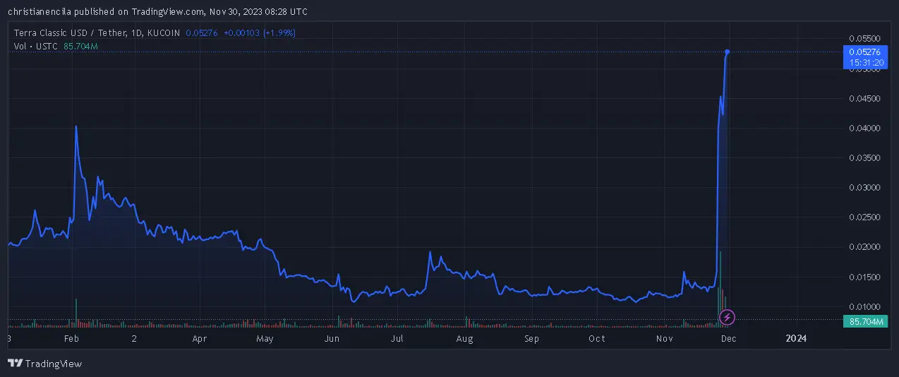 Notably, TerraClassicUSD’s value has nearly quadrupled within this period. It’s essential to contextualize this surge, however, as even with the substantial rally, the price of USTC has reached only $0.05, a stark contrast to its initial pegged value of $1.