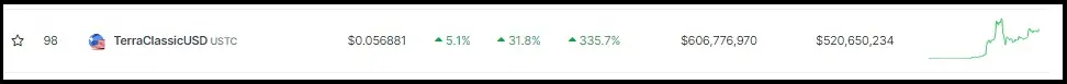 The value of the coin has increased significantly during the past day. Coingecko statistics shows that USTC surged a massive 32% to $0.05 in the previous day. Even more astonishingly, the cryptocurrency gained a commanding 335% over the previous seven days. During the specified period, its trading volume increased by 2,284%, with $1.21 billion exchanged.