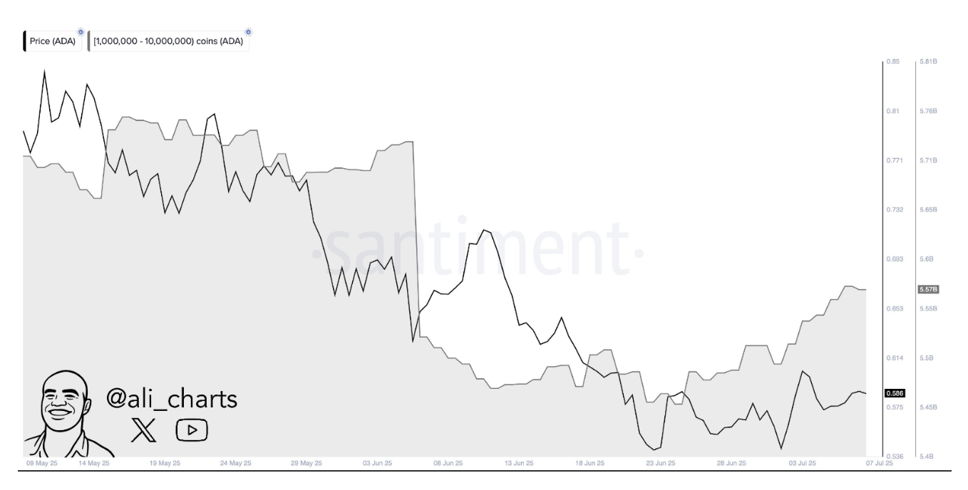 لاحظ محلل السلسلة علي مارتينيز أنه خلال الأسبوعين الماضيين، قامت عناوين الحيتان الخاصة بـ Cardano (التي تمتلك من 1 مليون إلى 10 ملايين ADA) بزيادة حيازتها بحوالي 120 مليون ADA. حالياً، تمتلك هذه الجهات الكبيرة في الأصول الرقمية حوالي 5.5 مليار ADA، والتي تقدر قيمتها بحوالي 3.3 مليار دولار وفقاً للأسعار الحالية.
