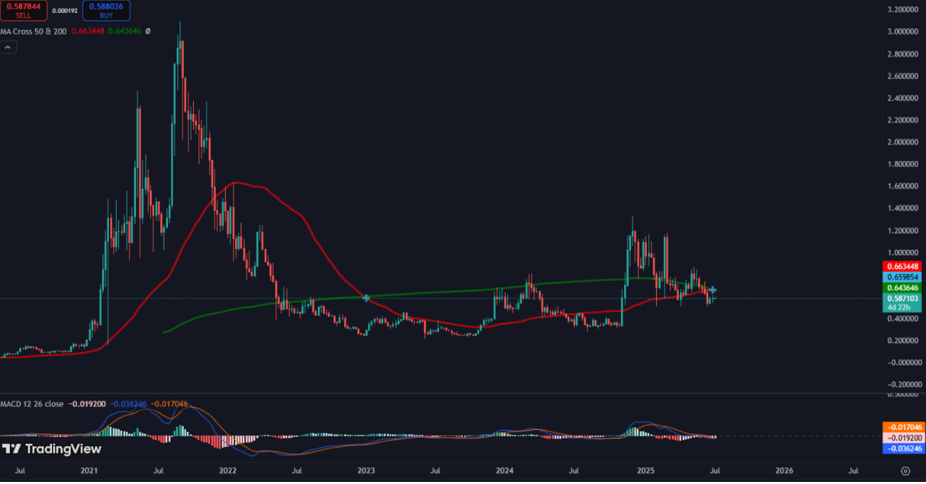 سعر تداول ADA الحالي حوالي $0.60، لا يزال تحت المتوسط المتحرك لمدة 50 يومًا ($0.66) والمتوسط المتحرك لمدة 200 يومًا ($0.64). هذا الفارق في الأسعار يعني أن حيتان ADA تحتاج إلى زخم أقوى لدفع السعر للعودة فوق هذه المستويات المقاومة الرئيسية. ومع ذلك، فإن نمط التقاطع الذهبي الأسبوعي هذا المؤشر الفني المتفائل لا يزال يجعل العديد من المشاركين في السوق يتوقعون ارتفاع ADA القادم.