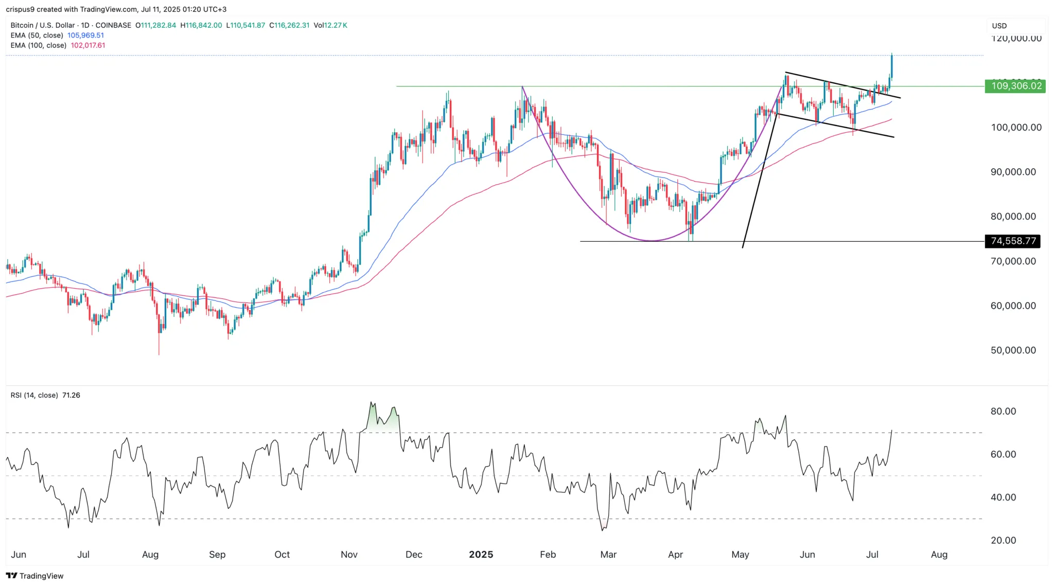 بالإضافة إلى ذلك، تُظهر الرسوم البيانية أن بيتكوين قد شكلت قاعين دائريين في اتجاه الصعود. وهذا يشير إلى أنها قد شكلت نمط كوب وعروة، وهو إشارة استمرارية عالية التفاؤل.