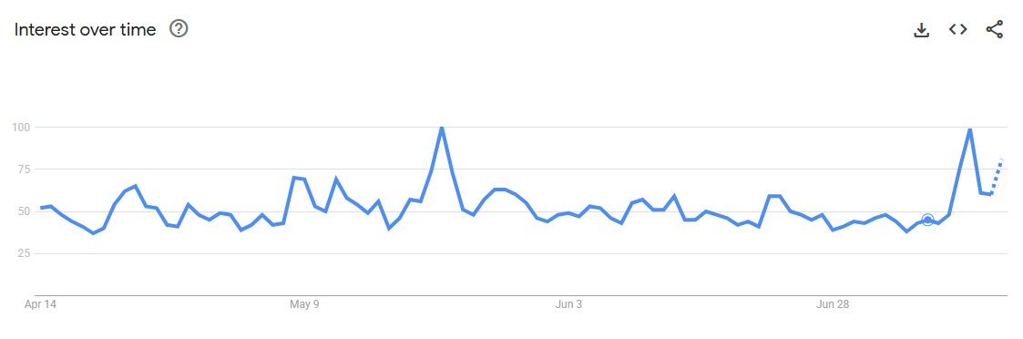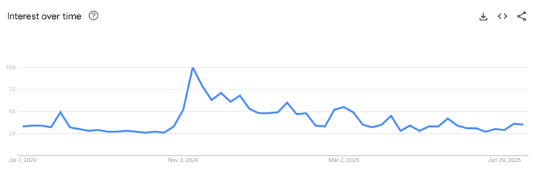 على سبيل المثال ، خلال فترة 90 يومًا على Google Trends ، ارتفعت اهتمام الناس ببيتكوين إلى 99 في 11 يوليو 2025. وكانت القمة الأخيرة (التي وصلت إلى 100 نقطة ضمن هذا النطاق الزمني) في 22 مايو 2025. اعتبارًا من 14 يوليو ، انخفضت النقاط إلى 77 من 100.
