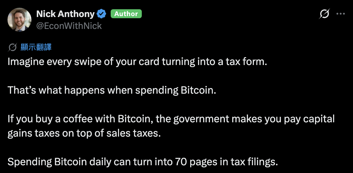 مصدر الصورة: X/@EconWithNick قال نيكولاس أنتوني، باحث في معهد كاتو في واشنطن، إن آلية الضرائب على البيتكوين الحالية تفتقر إلى المنطق