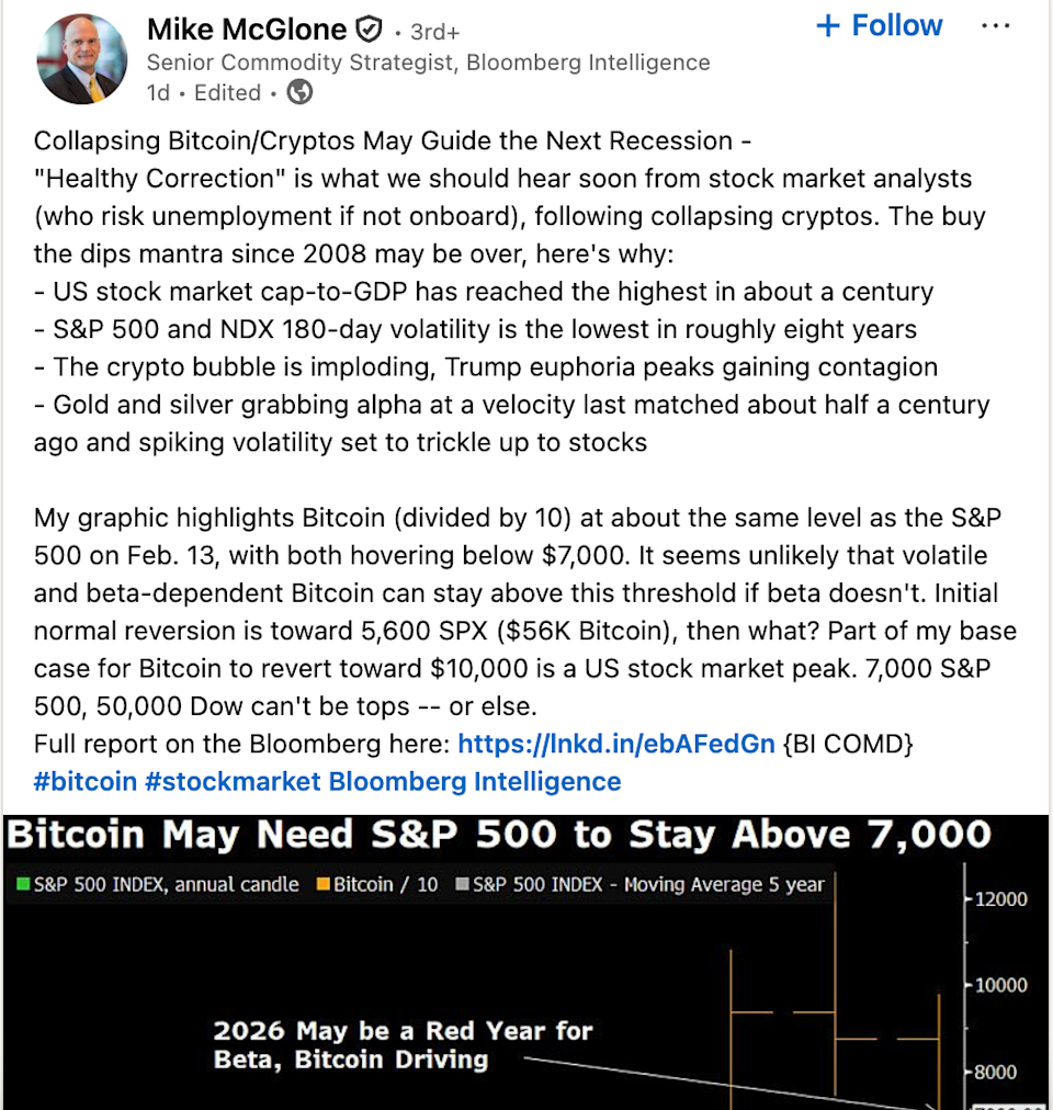 كتب مكلون على لينكد إن أن “انهيار بيتكوين/العملات المشفرة قد يوجه الركود القادم.”