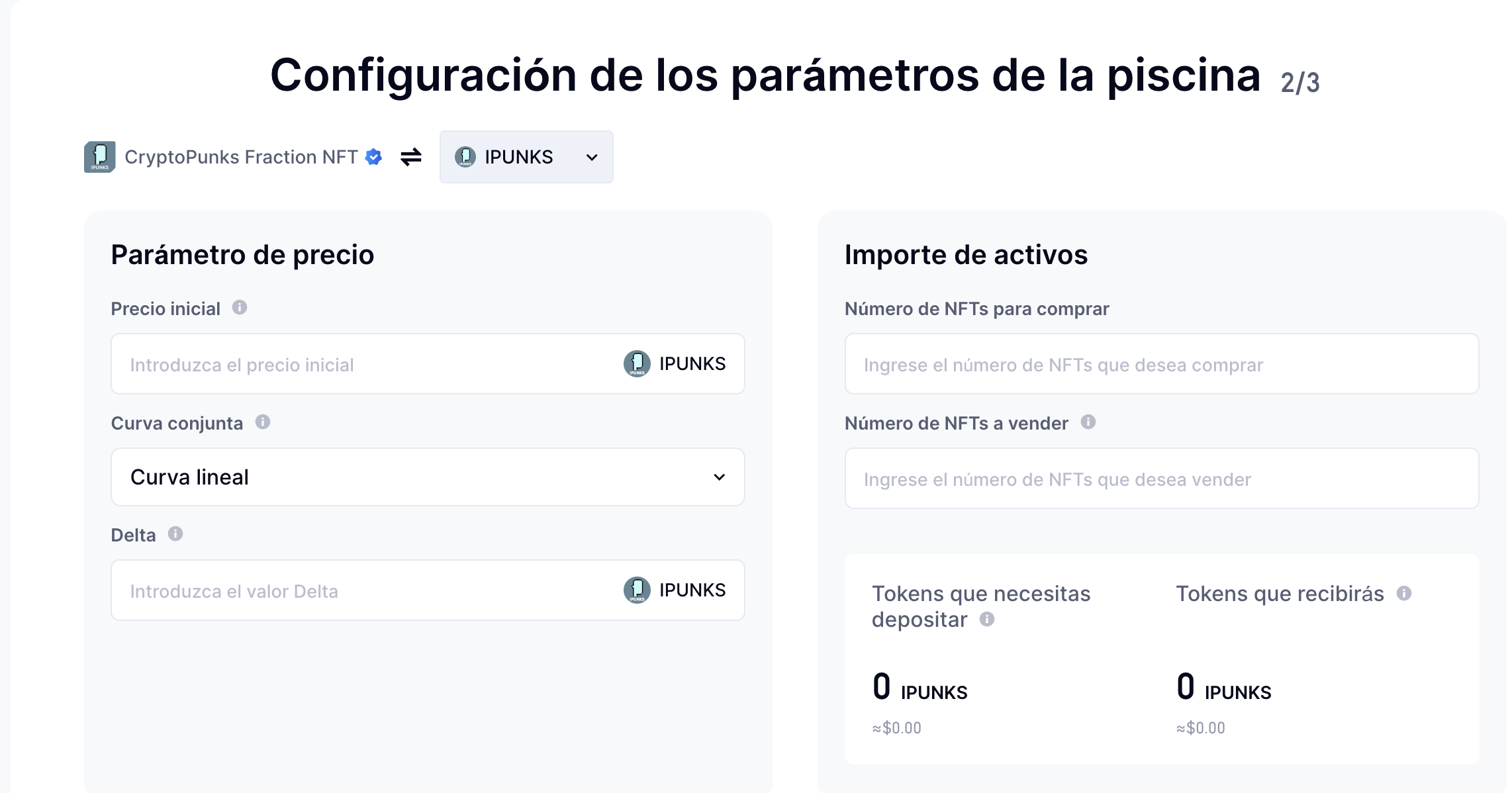 Para crear un pool de liquidez de NFT, inicia sesión en tu cuenta de Gate y utiliza la funcionalidad NFT AMM. Seleccione el tipo de pool, elija entre tres opciones (Comprar NFTs con tokens, Vender NFTs por tokens e intercambiar NFTs para ganar comisiones) y establezca los parámetros del pool de liquidez, incluido el porcentaje de comisiones de transacción que se cobran por transacción, el precio inicial del NFT, cómo cambia la curva de precios y la proporción de cambios en el precio del NFT después de cada transacción.
