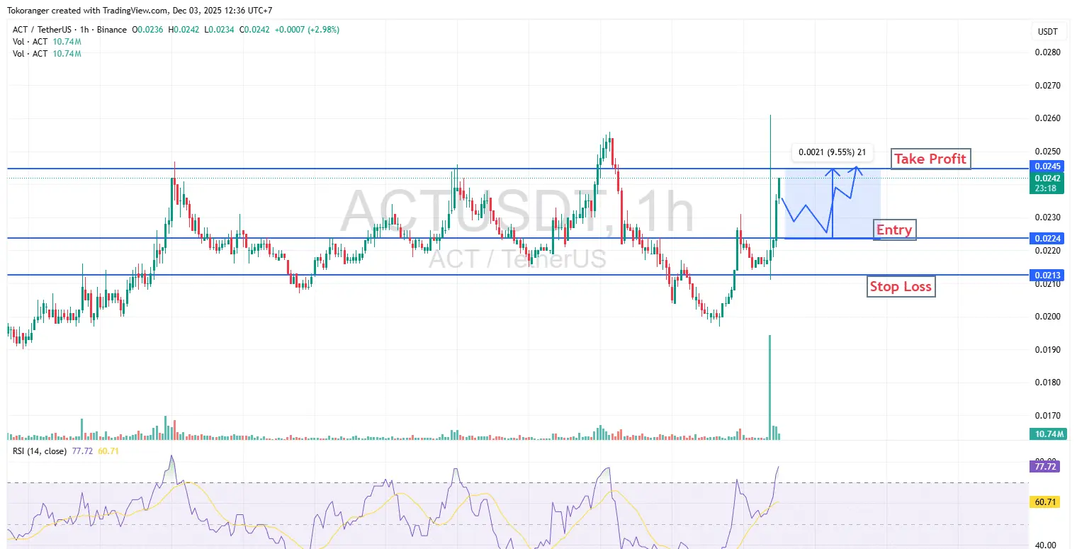 ACT/USDT se muestra bastante saludable después de rebotar con fuerza desde la zona de demanda $0.0213 y volver a superar el nivel medio del rango $0.0224, que ahora pasa a funcionar como nuevo soporte. El aumento de volumen en la última vela alcista confirma que los compradores toman el control, mientras que un RSI al alza pero acercándose a la zona de sobrecompra indica que el precio podría moverse lateralmente antes de continuar el rally.