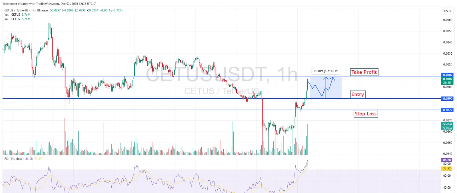CETUS/USDT muestra actualmente un “rebote” tras repuntar con fuerza desde la zona de demanda $0.0279-$0.0290, señalando que los compradores vuelven a tomar el mando del mercado. La subida rápida hacia el área de $0.0307 y la ruptura del midpoint del rango confirman el cambio de impulso, mientras que el RSI subiendo a zona de sobrecompra muestra un empuje alcista todavía fresco.