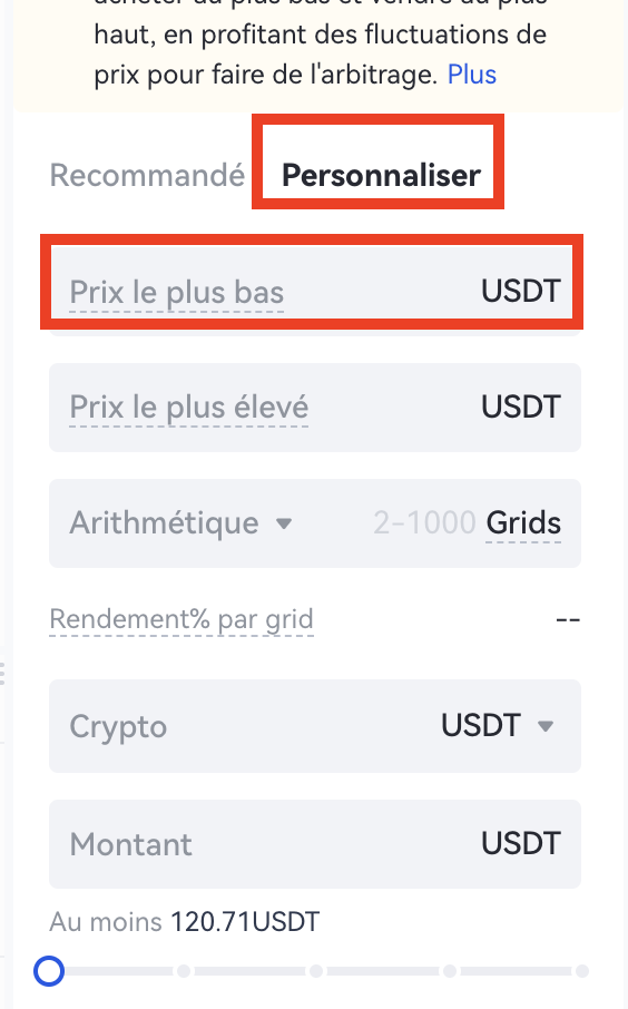 Entrez sur la page d'accueil de Gate - cliquez sur "Bots" - sélectionnez Spot Grid - cliquez sur "Bot" - Choisissez " Personaliser " - cliquez sur " Modification manuelle " - remplissez " Prix le plus bas " et d'autres paramètres.