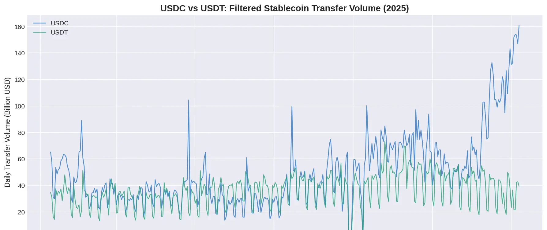 L’USDC a traité pour 18,3 trillions de dollars de transferts en 2025, contre 13,2 trillions de dollars pour l’USDT — un écart de 39 %.