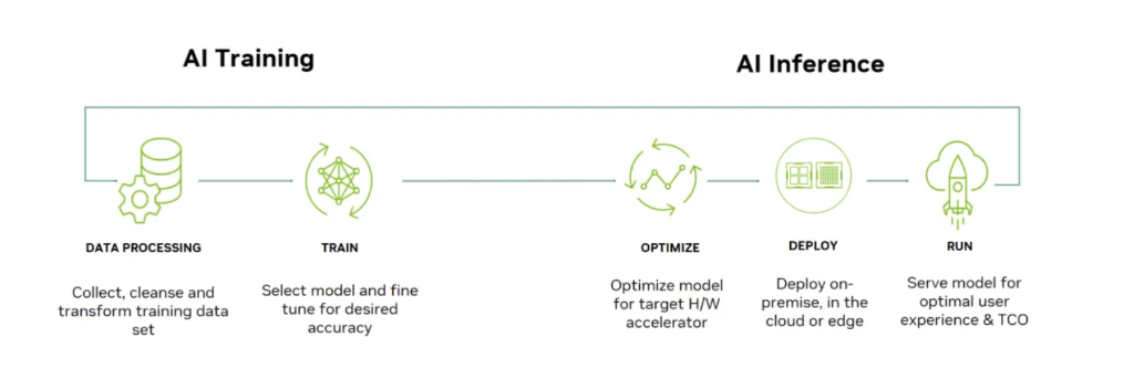 L’étape d’entraînement repose sur l’architecture Transformer publiée par Google en 2017 : elle requiert une propagation avant et arrière sur des ensembles de données massifs, une mise à jour continue des poids du modèle, impliquant des opérations matricielles à très grande échelle, des calculs de gradients et des mises à jour de paramètres. Elle nécessite généralement un calcul distribué pendant des semaines, voire des mois, sur des clusters multi-GPU ou multi-TPU. Les puces d’entraînement doivent donc offrir des cœurs de calcul à haute densité, une mémoire de grande capacité et à bande passante élevée (comme la HBM), ainsi que la capacité d’extension horizontale entre plusieurs puces.