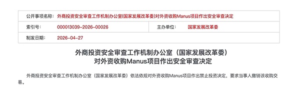 27 avril 2026, le Bureau du mécanisme de travail pour la sécurité des investissements étrangers (Commission nationale du développement et de la réforme) a pris la décision d’interdire l’investissement dans le projet Manus, conformément à la loi et aux règlements, en demandant aux parties de revenir sur cette acquisition.