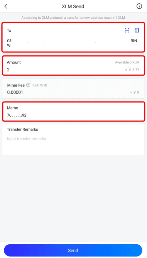 Step 4: Fill in the recipient address, deposit amount and the required memo.