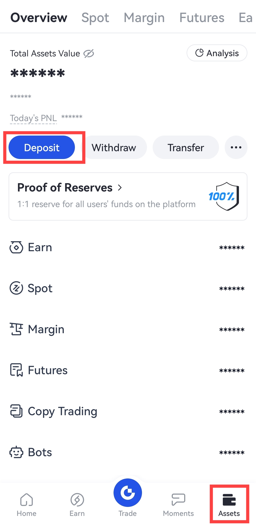 Step 5: Open Gate mobile App and log into your account. Go to "Assets" on the bottom right of the front page and click on "Deposit".