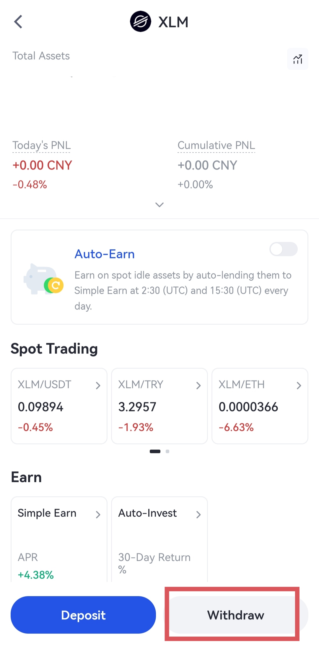 Alternatively, you can also go to "Spot Account". Enter and search "XLM". Then click on "Withdraw".
