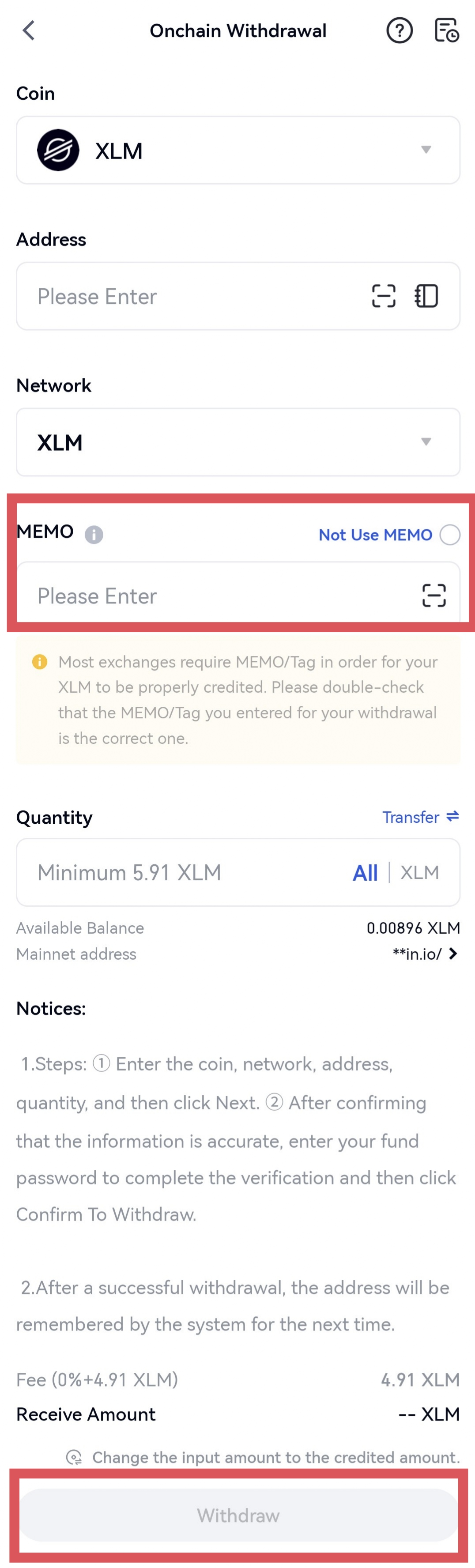 (1) The memo/tag must be entered in the “Tag/MEMO” box on the withdrawal page if you need to enter memo/tag.