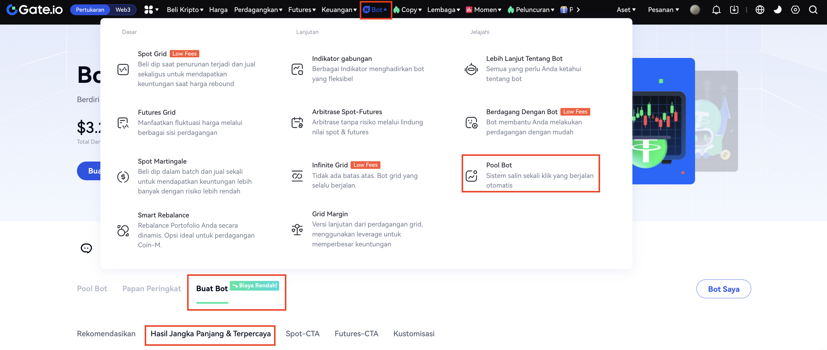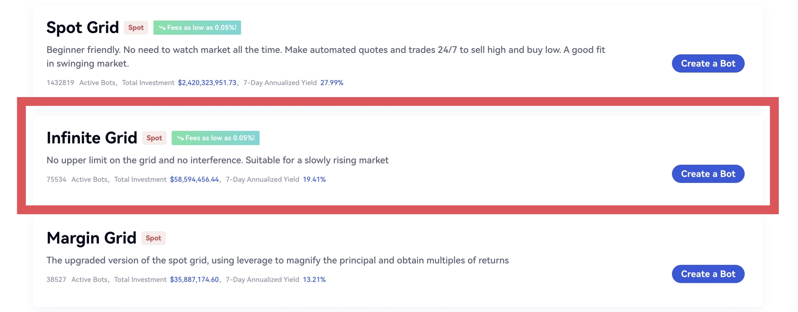 Web: Bilah navigasi – “Bot“ – ”Pool Bot“ – ”Buat Bot“ – ”Imbal Hasil yang Reliabel dan Berjanhgka Panjang“ – ”Infinite Grid“ – ”Buat Bot“。Kemudian pilih pasangan perdagangan,atur parameter dan klik ”Buat“。Seperti yang ditunjukkan pada gambar di bawah ini: