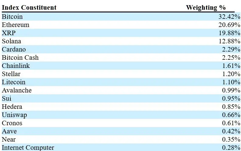Per 31 Desember 2025, bitcoin, ethereum, XRP, solana, dan cardano mewakili sekitar 88,15% dari total bobot indeks, sementara alokasi sisanya tersebar di 15 aset kripto tambahan, masing-masing dengan bobot di bawah 3% dan masing-masing melebihi $1 miliar dalam kapitalisasi pasar pada tanggal tersebut.