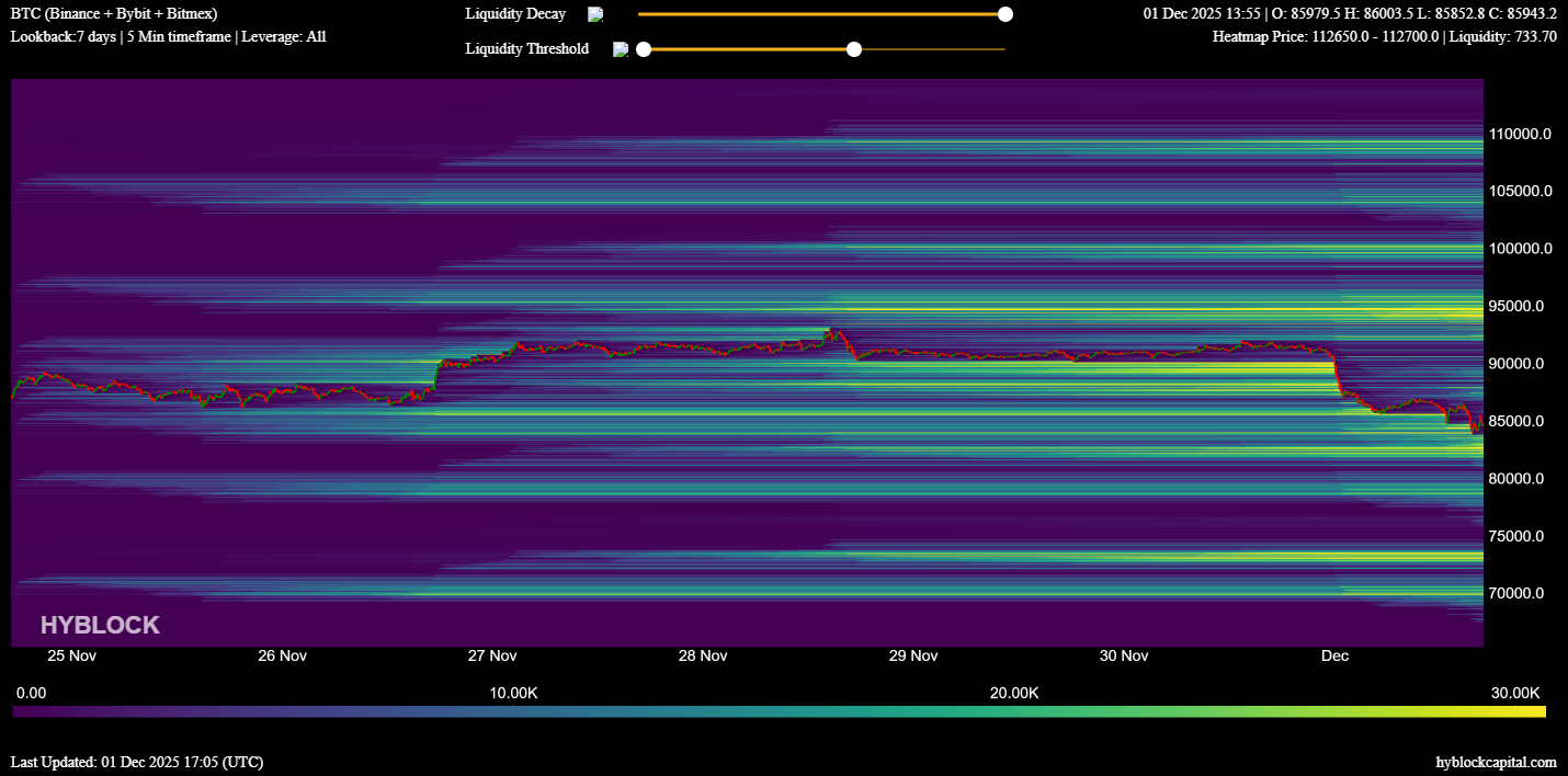 金曜日の93,300ドルから月曜日の85,000ドル未満へ、ビットコインはわずか2営業日で8%以上下落しました。この急速な反転は、93,000ドル付近に大量の売り圧力が蓄積されていることを示しています。これらの売り圧力は、いくつかの要因から来ている可能性があります:高い価格帯で捕まっている投資家が反発を利用してポジションを減らし、短期トレーダーが利益を確定し、テクニカルレベルでショートポジションを取るヘッジファンドがいます。いずれの出所であれ、結果は同じです:現物買い手の力はこれらの売り圧力を吸収するには不十分です。