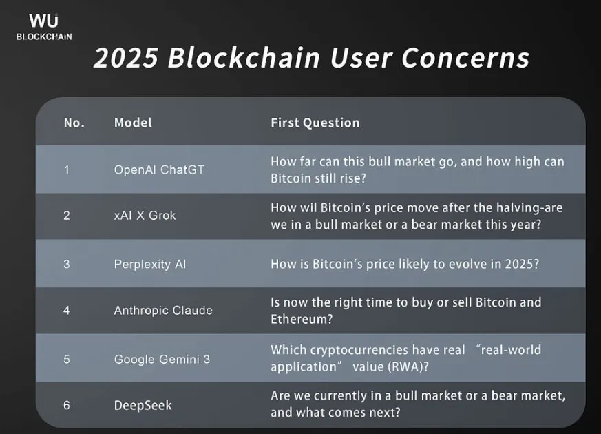 # AIが2025年の暗号投資家の主な恐怖を特定人気の言語モデルは、2025年の暗号通貨ユーザーの最も頻繁な質問を挙げました。これらは取引戦略から資産保護までさまざまな分野をカバーしています。実験はWu Blockchain編集部によって行われました。出典:Wu Blockchain。調査の著者はChatGPT、Grok、Perplexity、Claude、Gemini 3、DeepSeekを使用しました。同じ検索結果のデータを避けるために、モデルにはリアルタイムのウェブ検索の使用が禁止されました。AIは、長期的な議論のパターンに基づいて回答を生成しました。モデルの焦点:* ChatGPTはトレーダーの立場を取りました。主なテーマは、強気市場のピークの特定、「アルファ」の探索、プロジェクトの構造的リスクです;* Grokはソーシャルメディアのナラティブを反映しました。ハルビングの影響、市場フェーズに関する議論、ETFへの資本流入を強調しました;* Claudeは慎重なアプローチを選びました。市場参入のタイミング、詐欺の検証、初心者向けのリスク管理に焦点を当てました;* Gemini 3は産業トレンドに深く入り込みました。検索トップにはRWA、規制の個人資産への影響、L2、Solana、AIトークン間の競争が含まれました;* PerplexityとDeepSeekは、より一般的な結果を出し、検索サマリーに似た内容となりました:価格予測、詐欺防止、規制の変化。アナリストは、中国のモデルは「硬い」変数、すなわちサイクル、ハルビング、規制に焦点を当てる傾向が強いと指摘しました。また、AIの能力に依存していることも明らかになり、高度なモデルは回答をより具体的に構築し、より弱いモデルは価格や安全性に関する一般的なテーマに流れる傾向がありました。総じて、すべてのクエリは三つの方向に集約されます:サイクル内のポジショニング、利益獲得の方法、リスクの境界。なお、Asterのトレーダー大会では、人間のチームが人工知能に敗れました。