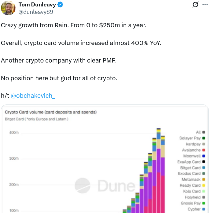「ステーブルコインカードは世界中で急速に成長しています」と、VCは付け加えました。これは、ステーブルコインスタートアップのRainが資金調達ラウンドで$250 百万を調達し、その評価額をほぼ$2 十億に押し上げた後のことです。
