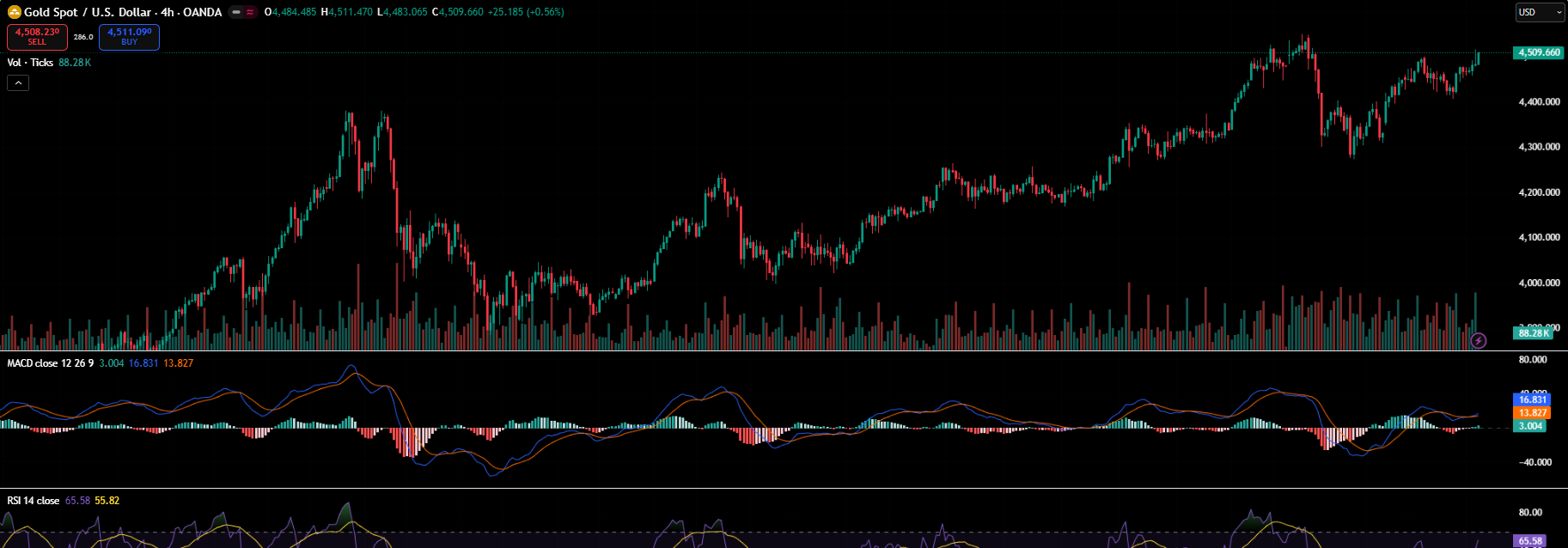 執筆時点で、金は1オンスあたり約4,510ドルで取引されており、その日の上昇は約56.97ドル((+1.28%))で、より高い高値と高値を維持する構造を拡大している。