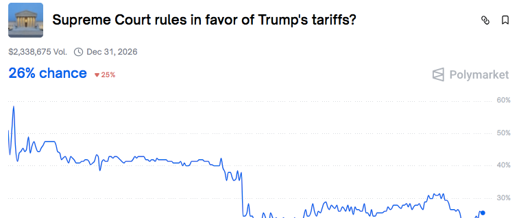 Polymarketでは、トレーダーは関税支持の判決の可能性を低く見積もるようになった。現在の契約は26%の確率を示しており、取引期間の早い段階よりも低下している。取引総量は約234万ドルに達している。