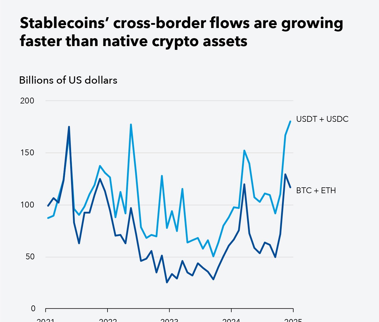 最も顕著な変化は、ステーブルコインの利用方法です。国際送金に関連した活動は、主要な暗号通貨の流れよりも速く加速しており、投機的な用途から実体経済の機能へとシフトしていることを示しています。実際には、ステーブルコインは単に暗号市場内で資金を循環させるのではなく、国と国の間で資金を移動させる役割が増しています。