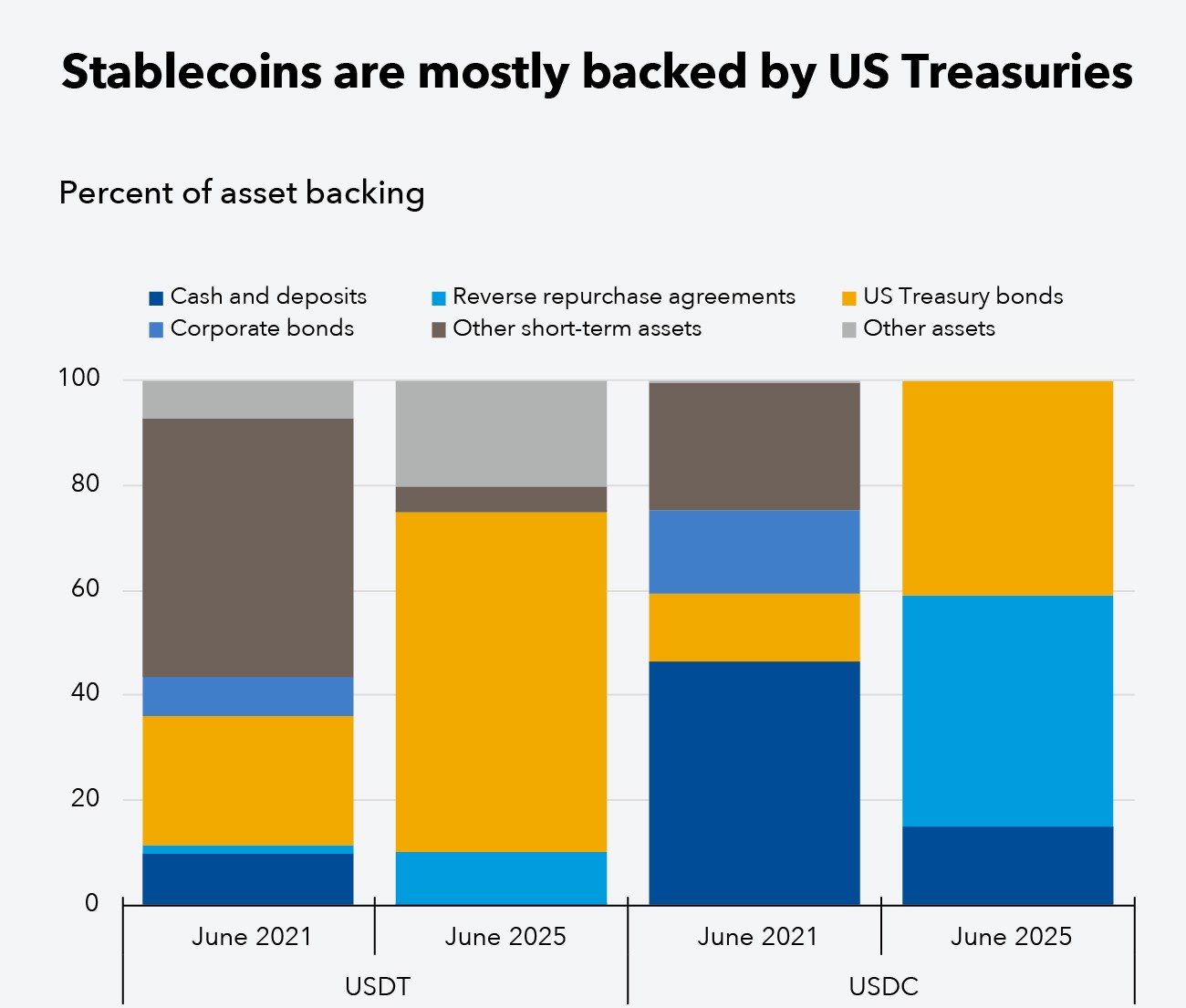 ステーブルコインの普及を後押ししているもう一つの理由は、そのバランスシート構造の進化です。最大の発行者は、短期の米国政府債務や現金に近い金融商品に大きく依存しており、これが二つの重要な結果をもたらしています。