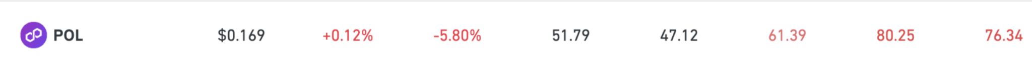 Polygon (POL)は、価格が$0.169で、直近24時間で5.8%の下落を示していますが、その一方でRSIの値はより明確な動きを示しています。