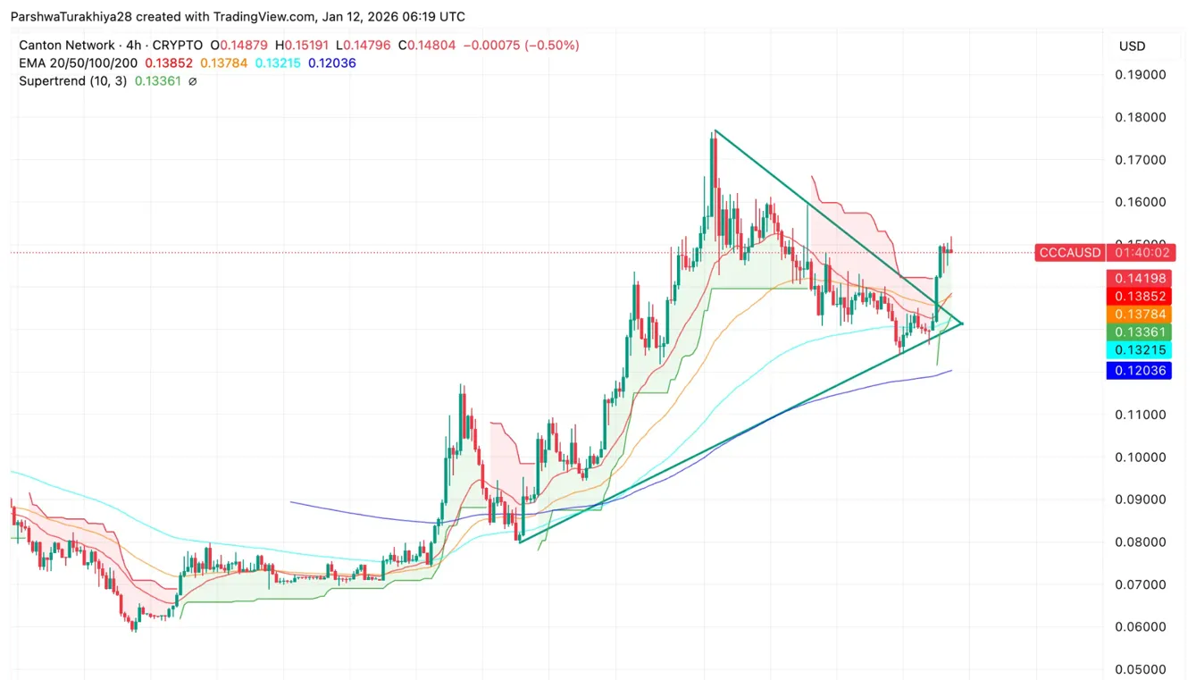 ソース:CoinEditionオリジナルタイトル:Canton Price Prediction 2026: DTCC Treasury Tokenization and $6T Asset Processing Target $0.25-$0.50オリジナルリンク:## 主要ハイライト* Cantonネットワークはすでに機関投資家規模で運用されており、600以上の機関と500,000の毎日の取引で$6 兆の資産を処理しています。* DTCCのSECノーアクションリリーフによる米国財務省トークン化は、規制されたブロックチェーン採用における大きな突破口です。* 実際の利用に連動したデフレーション的な手数料燃焼により、Cantonコインは機関投資家の取引量増加から直接恩恵を受ける位置にあります。Cantonネットワークは2026年上半期に、DTCCとの提携により米国財務省証券のトークン化を実現し、SECのノーアクションレター承認を得て、$6 兆のトークン化資産を600以上の機関で処理し、2025年には毎日$100 億のレポフローを記録、Goldman SachsやBNY Mellonのコンソーシアムの支援、Chainlinkのスーパー検証者統合、そして毎日50万件の取引が本番運用を示し、実験的なパイロットからの移行を証明しています。## 技術的なセットアップは圧縮を示すCCは$0.14804で、12月末に$0.18に急騰した後、$0.13-$0.15の対称三角形の中で統合しています。EMAは$0.13852/$0.13784/$0.13215/$0.12036で密集しており、$0.13361のSupertrendがサポートを提供しています。強気派は$0.15を超える取引量が必要で、三角形を破って$0.18、その後$0.20へ向かいます。サポートは$0.13361-$0.13852。$0.13を下回ると$0.12の再テストリスクがあります。## 4つの機関投資家向けカタリスト### DTCCが米国財務省証券をトークン化2026年上半期、Depository Trust & Clearing Corporation(DTCC)はCantonを使用して米国財務省証券のトークン化を行います—前例のない機関投資家向けブロックチェーン採用です。DTCCは米国証券取引の大部分を清算し、Cantonの選定は、過去10年以上にわたり主流のブロックチェーン採用を妨げていた厳格な要件を満たしていることを示しています。金融企業は決済遅延により$25 億ドルの超過担保を保有しています。Cantonは、トークン化された財務省証券を用いたライブ週末取引を完了し、クロス担保レポ取引を実現しました。Tier 1の機関は、即時の支払い対履行決済を通じて年間最大$346 百万ドルの利息収入を得ることが可能です。運営コストは取引価値の最大57%を占め、多くの企業が担保の引き渡しに苦労しています。### SECノーアクションレターが規制の明確さを提供米国証券取引委員会(SEC)は、Cantonのユースケースに対して明示的な規制承認を示すノーアクションレターを発行しました。これにより、金融サービス全体で長年規制の曖昧さに制約されてきたブロックチェーンの採用に参加できるようになりました。DTCCの使命はリスク低減と市場の健全性にあり、その採用は、Cantonが規制監督の下で信頼性を持って大規模に機能できると評価されていることを反映しています。### Goldman Sachs、BNY Mellon、Deutsche BörseコンソーシアムCantonは2023年5月にGoldman Sachs、BNPパリバ、Deutsche Börse、Microsoft、Deloitteを含むコンソーシアムによって立ち上げられました。Goldman、BNY Mellon、CBOEを含む複数の銀行は、2025年3月にテストを完了しました。これらの機関は既存のクライアント関係、規制ライセンス、運用の専門知識を持ち、即時の展開を可能にしています。Cantonは、ブロックチェーンが機能することを説得する必要はなく、その参加者は実装している機関です。### $6T 資産、600以上の機関、毎日50万件の取引毎日の取引量は50万件に達し、600以上の機関が$6 兆の実世界資産を処理しています。CCは2025年に$100 億のレポフローを処理しました。これらの指標は、実験的なテストではなく、本番運用を示しており、機関はCantonのインフラ上で実際の金融取引を行っています。ネットワークは「ネットワークのネットワーク」として機能し、Global SynchronizerがCantonコインを用いてクロスドメインの活動を調整し、規制された機関が敏感なデータを公開せずに安全に取引できる仕組みを提供します。## プライバシー重視のアーキテクチャが機関投資家の課題を解決Cantonは大規模な機密取引を可能にします—金融機関はオンチェーンで取引しながら、データの可視性を詳細に制御できます。参加者は、どの相手先、サービス提供者、資産が特定の取引情報を見ることができるかを決定します。これにより、機関はブロックチェーンの利点を活用しつつ、ポジションや相手先、流動性の動きなどを公開せずに済みます。従来のブロックチェーンの透明性は金融プライバシーの要件と衝突しますが、Cantonはこの根本的な不整合を解決します。## Chainlink統合とデフレーショナリートークン経済学CantonはChainlink Scaleプログラムに参加し、Data Streams、Proof of Reserve、NAVLink、CCIPを統合しています。Chainlink LabsはGlobal Synchronizerのスーパー検証者に就任しました。ChainlinkはDeFiで$100 億ドル以上を保護し、戦略的にテストされたオラクル技術をCantonの機関投資家向け環境にもたらします。Cantonコインはネイテ