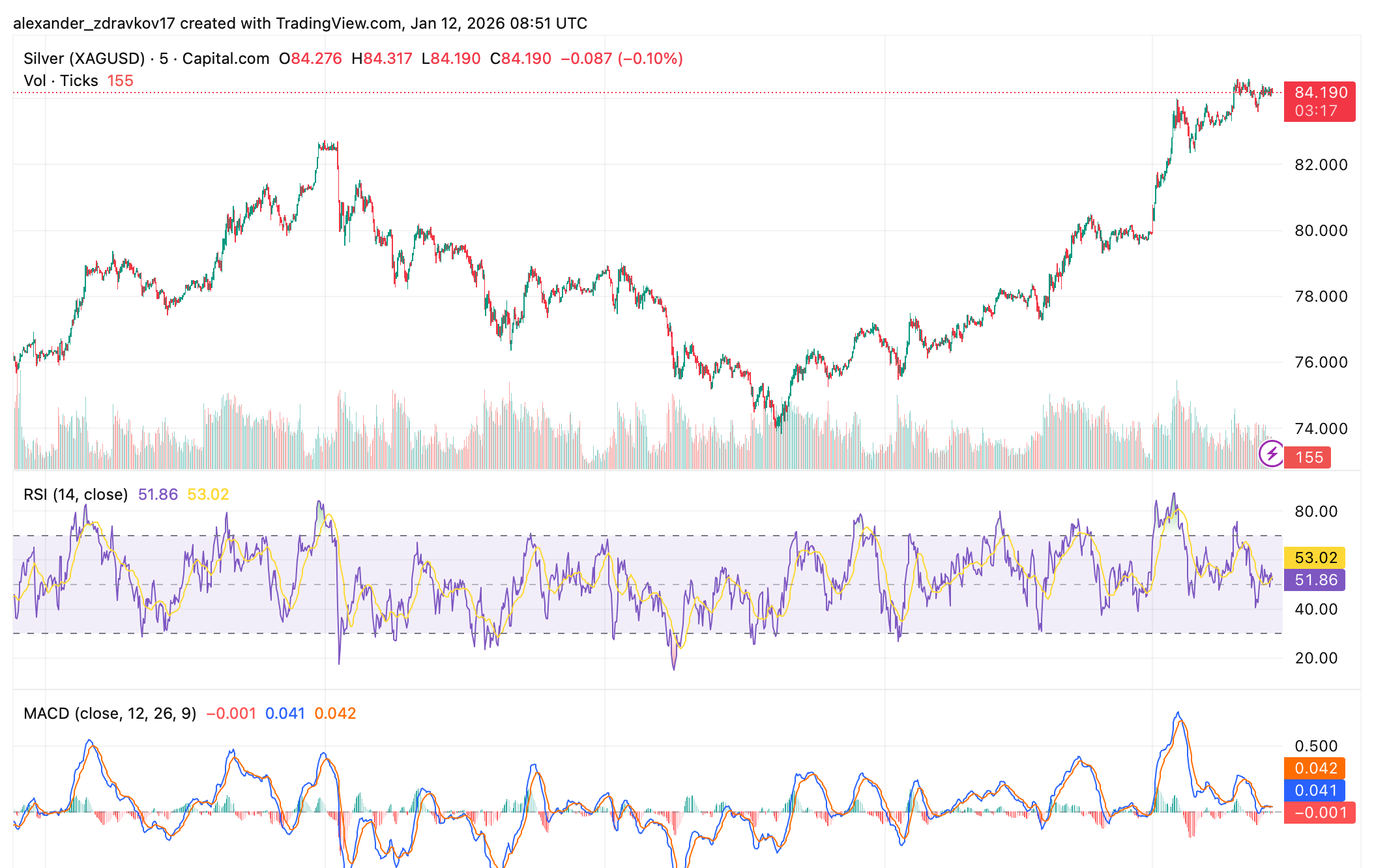 この動きの背後にあるテクニカル構造は著しく強力です。日中チャートでは、銀は$84.00 – $84.30ゾーンに急騰し、利益を保持しながら高値からの急激な拒否を避けました。この価格挙動は、本物のブレイクアウトに典型的であり、供給が吸収される一方で積極的に売られることはありません。重要なのは、モメンタム指標がトレンドの継続を確認しており、反転の警告を出していない点です。