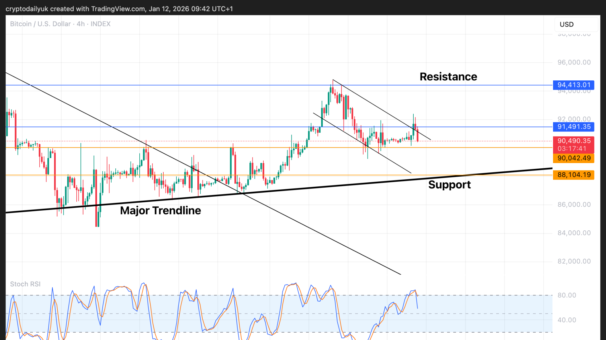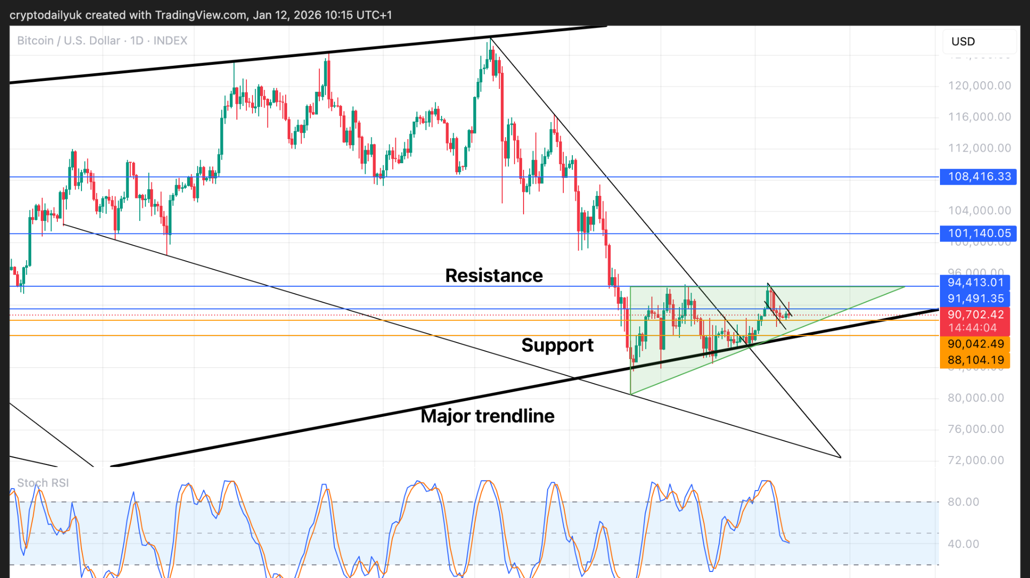 Source: CryptoDailyOriginal Title: Bitcoin (BTC) 価格予測:ブルフラッグブレイクアウトのターゲット $97K – モメンタムの高まり 1月12日Original Link: ## ブルフラッグブレイクアウトまたはフェイクアウト?ビットコインの価格は月曜日の早い段階で$92,000を超えることができましたが、その後再び下落しました。BTC価格の短期タイムフレームチャートは、非常に短時間で強気から中立/弱気に変わっています。小さなブルフラッグのブレイクアウトは確認されたように見えましたが、その後、決定的に見える赤いキャンドルが価格をフラッグ内に戻しました。価格は再びフラッグから出現する可能性もあり、$90,000で強力なサポートを受けていることを考えると、その可能性は十分にあります。全体的に見ると、ビットコインは強気の展望が見えています。多額の負債をロールオーバーする必要があり、それが大規模なマネー印刷につながり、ビットコインをさらに高騰させる可能性があります。## 上昇三角形パターンは依然として最も強力なストーリー日足タイムフレームは、状況をより明確に示しています。巨大な下降ウェッジパターンの完璧なブレイクアウトは、比較的短い分配フェーズの後に再び動き出す寸前のように見えます。小さなブルフラッグのブレイクアウトは一時的に失敗したかもしれませんが、最終的にブレイクアウトする可能性が高いです。もしそうでなくても、上昇三角形はより大きなパターンであり、これを突破すれば、重要な抵抗レベルの$108,000への測定された動きがターゲットとなります。日足のストキャスティックRSI指標は下降しているため、さらなる弱気の価格動きはこれらをさらに下げるだけであり、最終的に反転したときにより上昇の勢いを示すことができるでしょう。## これも弱気市場の底のよう?週足チャートは、BTC価格が$94,000の水平レベルを突破した後、$101,000と$108,000の2つのステップを経て、最終的に$126,000の史上最高値に向かう最後の上昇段階に入ることを示しています。ビットコインはこれ以上ないほど打ちのめされており、実質的に弱気市場の底に相当する安値に達しています。現在のラリーは深いブルマーケットの調整からのものだけではなく、まるで弱気市場の底が形成され、今や価格が上昇するにつれて信じ難い段階に入っているかのようです。もし巨大な強気の緑のキャンドルがブレイクアウトし、上昇三角形の上に立つなら、この市場の変化を一瞬で目の当たりにするでしょう。ビットコインはしばらくの間、他の資産に後れを取ってきましたが、その時は近づいています。そうなると、素晴らしい光景が見られるかもしれません。
