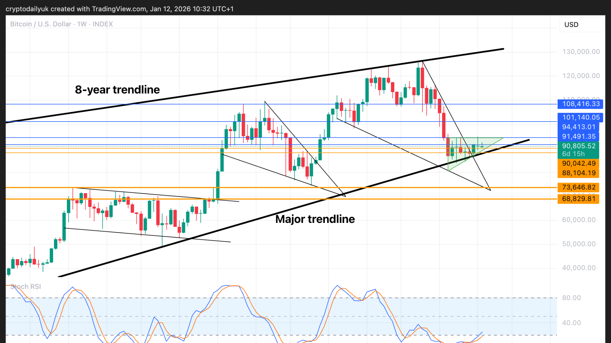 週足チャートは、BTC価格が$94,000の水平レベルを突破した後、$101,000と$108,000の2つのステップを経て、最終的に$126,000の史上最高値に向かう最後の上昇段階に入ることを示しています。