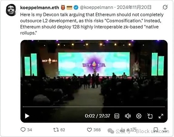 たとえば 2024 年の Devcon SEA カンファレンスで、Gnosis の共同創業者 Martin Köppelmann が「イーサリアムにはネイティブな L2 が必要だ」という題名の講演を行い、L2 層の相互運用性を妨げるさまざまな信頼前提に焦点を当てました。そのため彼は、ゼロ知識証明に基づくロールアップを開発し、それによってイーサリアムと同期して読み書きできるようにするべきだと呼びかけました。