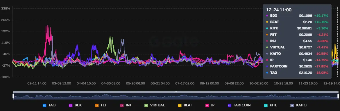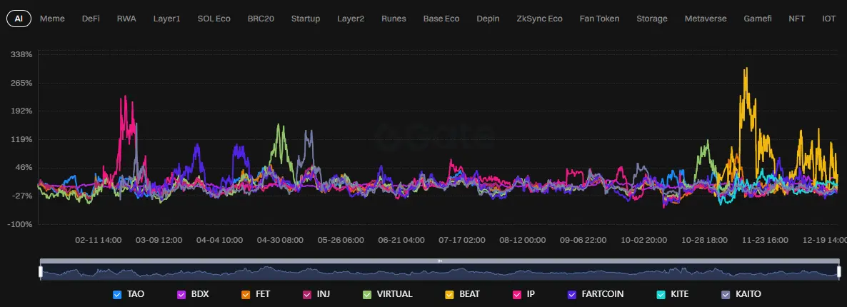 Long-term performance data across the AI token cohort indicates a meaningful shift in how the market is pricing the AI narrative. The “AI beta trade” phase—where most tokens rallied together on a shared story—has largely come to an end. The market is now entering a phase of deep dispersion, where returns are no longer evenly distributed but instead concentrated in a very small number of projects at very specific moments in time.Chart observations show that the majority of AI tokens have hovered around low or negative performance levels for extended periods. Sharp rallies do occur, but they tend to be short-lived, quickly absorbed by supply, and followed by a reversion toward equilibrium. This behavior reflects a capital environment dominated by event-driven flows and tactical positioning rather than long-term accumulation based on conviction. In other words, AI is no longer being priced as a continuous growth theme, but rather as a basket of high-risk assets that require clear catalysts to attract capital.