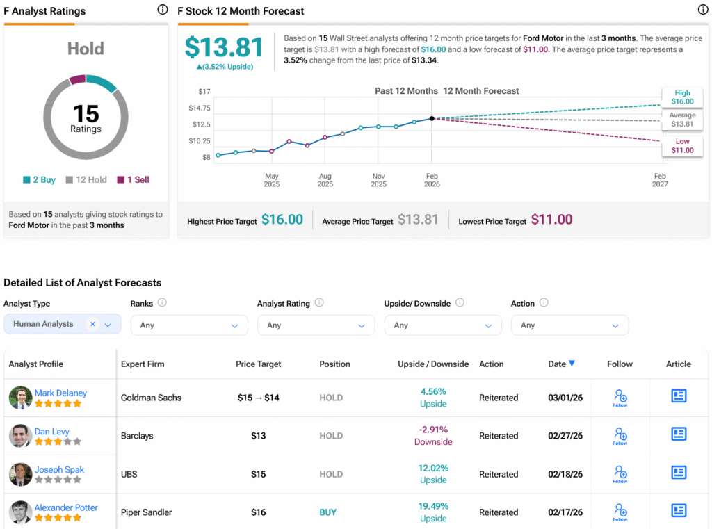 Turning to Wall Street, analysts have a Hold consensus rating on F stock based on two Buys, 12 Holds and one Sell assigned in the past three months, as indicated by the graphic below. After a 50.05% rally in its share price over the past year, the average F price target of $13.81 per share implies 3.52% downside risk.