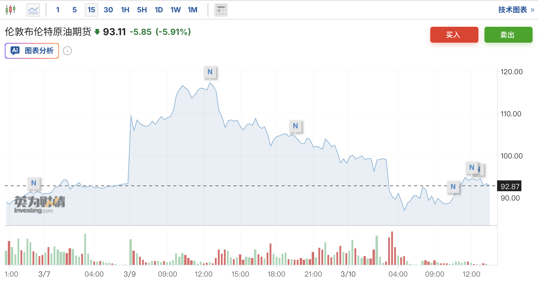 The actual blockade of the Strait of Hormuz has already thrown the global energy market into chaos, previously pushing Brent crude futures close to $120 per barrel; however, US President Trump hinted on Tuesday that the war might end soon, causing futures prices to fall sharply. As of the latest update, prices are at $93.