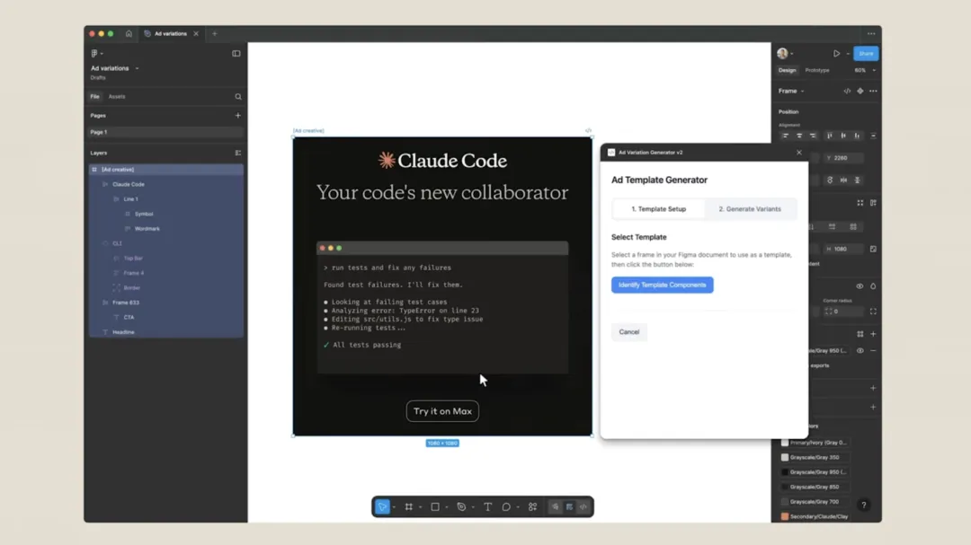 The plugin works by selecting a static image frame; it automatically recognizes components like titles, call-to-action buttons, code blocks, etc., then batch-generates separate Figma frames from a prepared copy list, each variant with a new set of copy. It can generate up to 100 ad variants per batch, taking about half a second per batch. What used to take 30 minutes of manual work now takes 30 seconds.