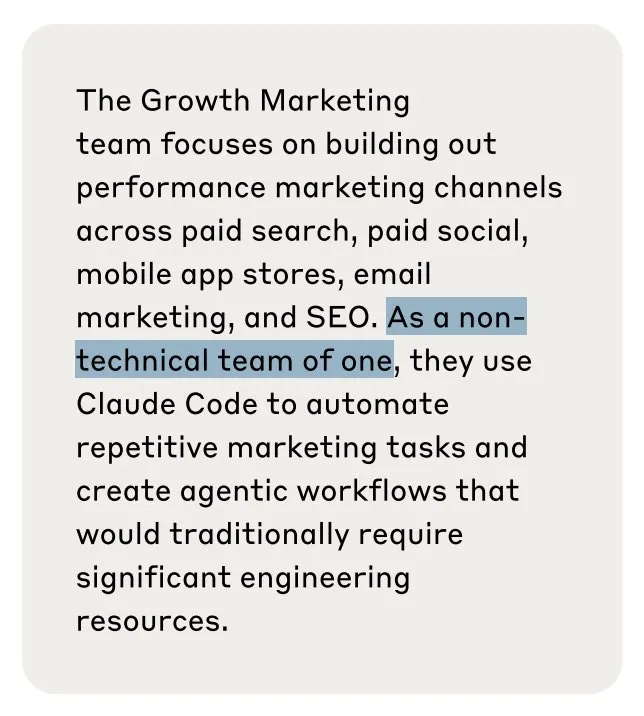 The white paper states: The growth marketing team focuses on channels like paid search, paid social, mobile app stores, email marketing, and SEO, and is described as a “non-technical one-person team” relying on Claude Code to automate repetitive marketing tasks, building workflows that traditionally require significant engineering resources.