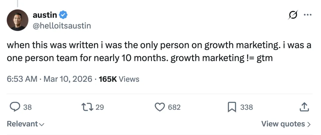 Austin recently added some background on LinkedIn. He pointed out that the widely circulated article describes his experience as the sole growth marketer in Q2 2025—almost eight months ago. The team did expand later, though still much smaller than outsiders imagine. As he put it, “Our combat effectiveness far exceeds our headcount.”