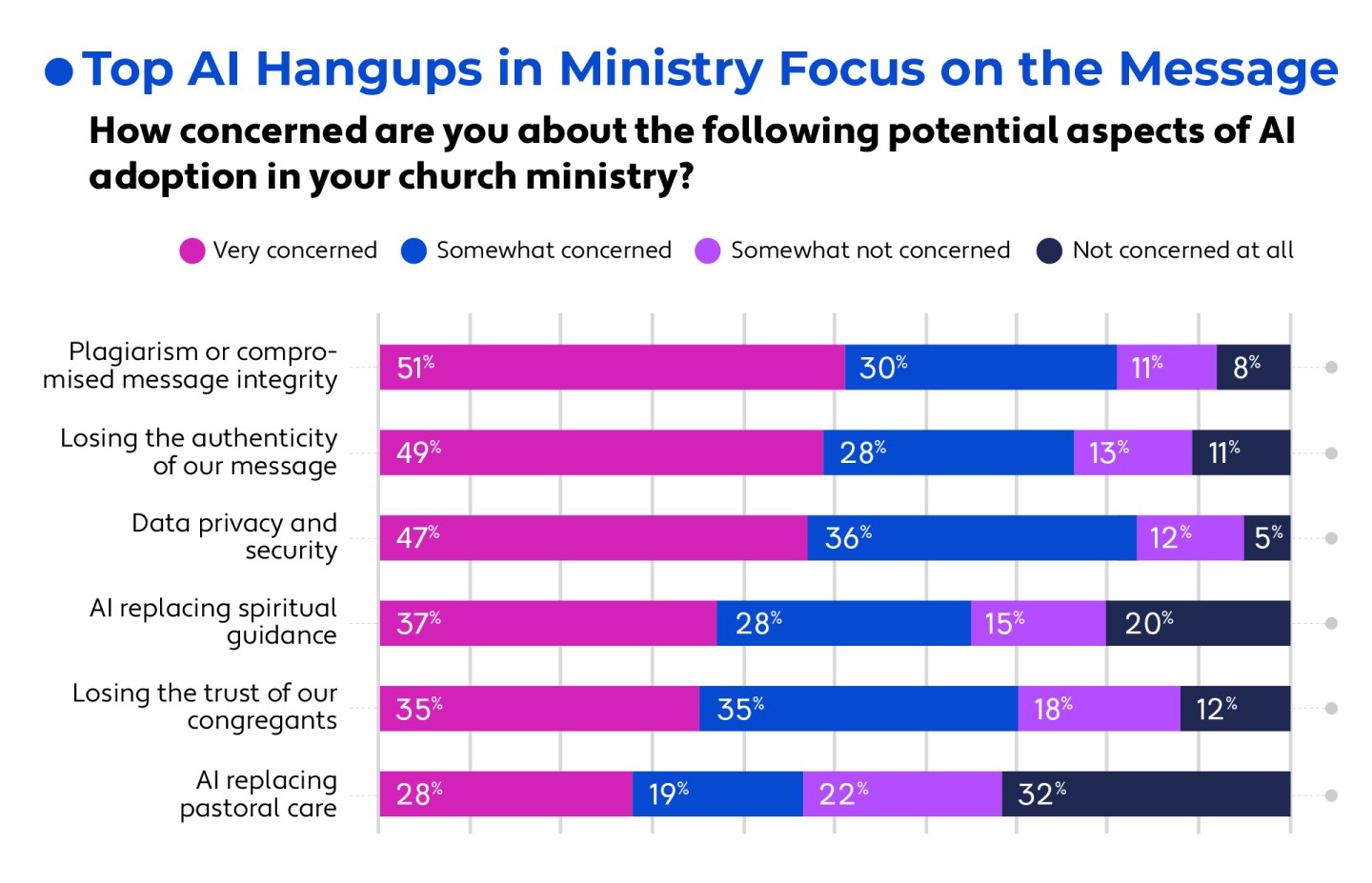 Today, a majority of church leaders (58%) also say that, to their knowledge, their church is not using AI. One third report using AI to some capacity, while the remaining 8% say they weren’t sure. The survey found that the most common use cases included generating or editing written church communication, graphics, social media posts, and in some cases, despite Pope Leo’s concerns—preparing sermons.