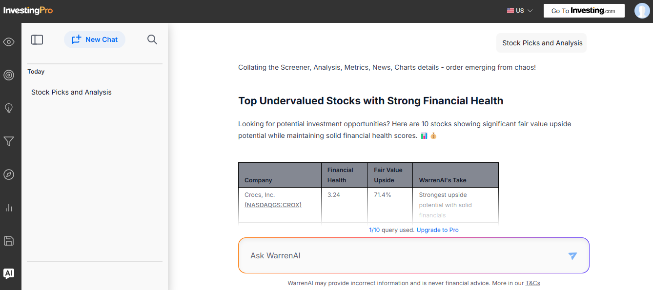 Unlike general-purpose AI tools, WarrenAI is built directly on Investing.com’s financial database. The company says the tool gives users access to more than 1,200 metrics across over 70,000 instruments, alongside ten years of historical data. The integration of market data allows for functionality including automated charting, summarization of financial reports, and stock comparison tools.
