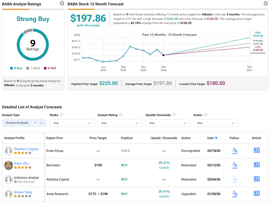 Wall Street remains constructive on the stock. Alibaba carries a Strong Buy consensus rating, based on eight Buy ratings and one Hold over the past three months. The average BABA price target stands at $197.86, suggesting roughly 45.18% upside from current levels.