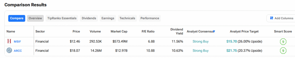MSC Income Fund MSIF -2.43% ▼ – MSC Income Fund is also a business development company that provides financing to middle-market companies through private debt and equity investments. The stock carries a dividend yield of 11.56% and a Smart Score of Nine. In the last three months, all four Wall Street analysts covering MSIF stock have rated it a Buy, with their 12-month consensus price target indicating an upside of about 26%.